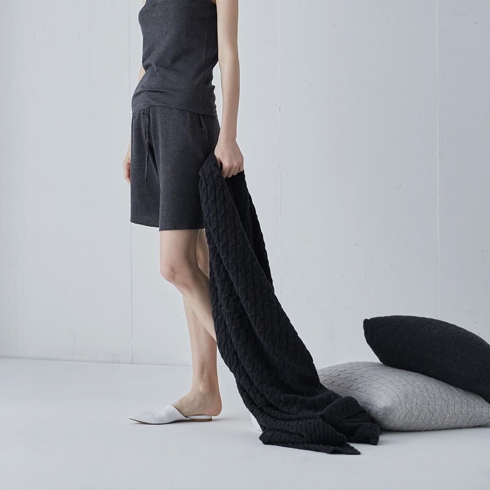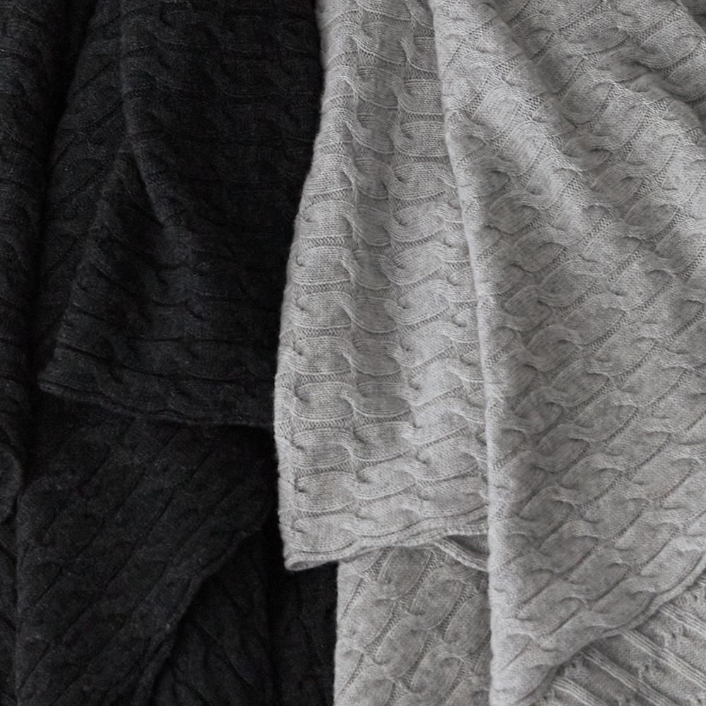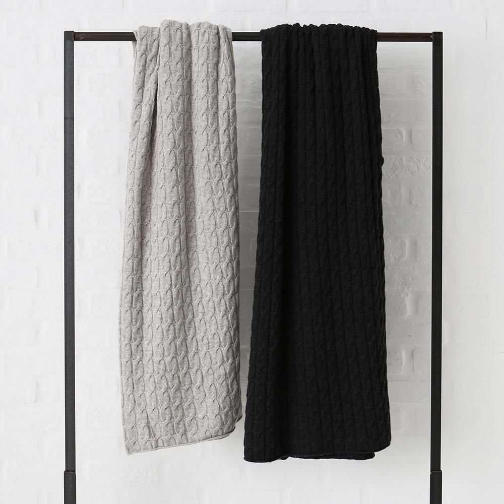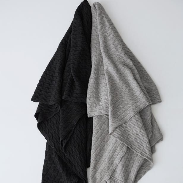 ウールと上質なカシミアで暖かい、ニットらしいケーブル編みが特徴的なスローブランケット。