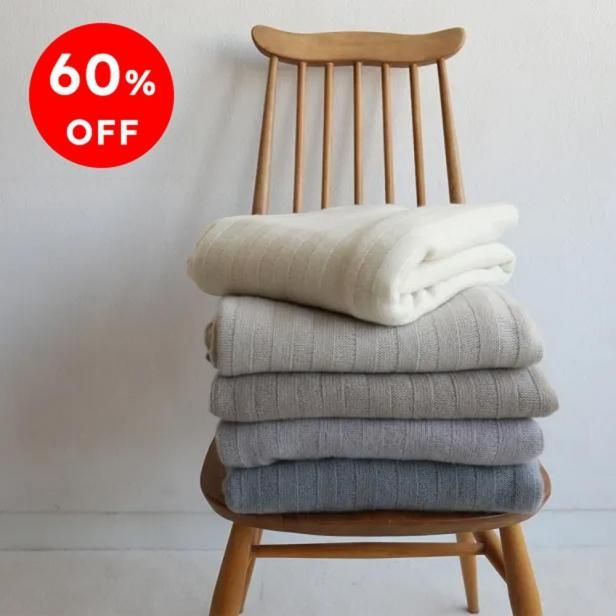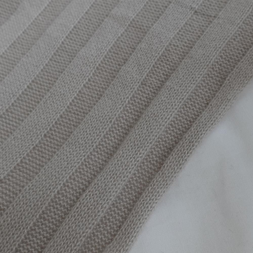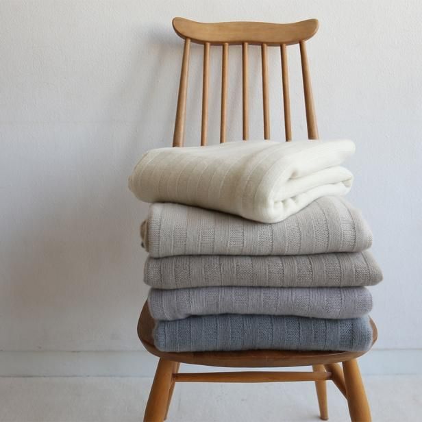 ひざ掛けや肩掛け、ベッドスローにインテリアスロー、どこでも使える万能さもあります。幅のあるリブ編みは上品さと、伸びの良さにも繋がっています。