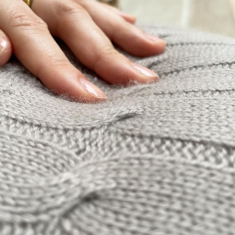 目を引くアラン編み、とても細かく繊細。それが上品で高級感もたっぷり感じます。